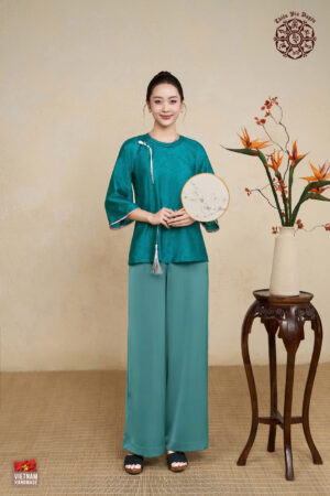 - Sắc xanh mộc trầm lắng như hơi thở của rừng sâu, nuôi dưỡng năng lượng sinh khởi, giúp người mặc dễ dàng trở về với nhịp điệu nguyên bản của chính mình
